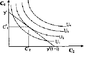 Кривые безразличия U1, .U4 отражают меру предпочтения субъекта сегодняшнего потребления будущему при различных уровнях дохода (то есть они выражают все приемлемые для субъекта комбинации С1 и С4).
