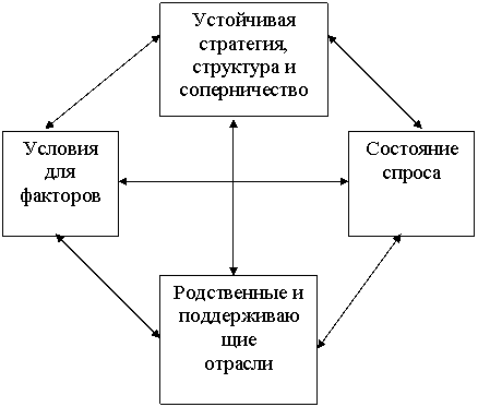 лежит в четырех атрибутах страны, которые каждый в отдельности и все вместе составляют основу конкурентных преимуществ страны, то пространство , которое каждое государство создает и поддерживает для своих отраслей.