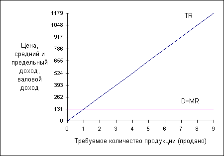 Поскольку фирма может продать дополнительные единицы продукции по постоянной цене, кривая ее предельного дохода (MR) в условиях чистой конкуренции совпадает с ее кривой совершенно эластичного спроса (D). Кривая валового дохода фирмы (TR) имеет вид прямой восходящей линии.