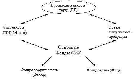 Производительность труда с одной стороны является производной показателей объема выполненной продукции и численности ППП; с другой стороны этот же показатель можно получить, определив произведение показателей фондоотдачи фондовооруженности. Таким образом, взаимосвязь показателей ПТ, его фондовооруженности и фондоотдачи материальных элементов основных фондов основана на использовании ОФ предприятия и, не только как главного ресурсного составляющего предприятия, но и важного фактора эффективности использования трудовых ресурсов.