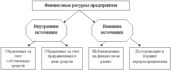 Формирование финансовых ресурсов осуществляется из различных источников, которые можно подразделить на внутренние и внешние. Внутренние источники образуются за счет собственных и приравненных к ним средств и связаны с результатом хозяйствования. Внешние – поступления ресурсов на предприятие извне.
