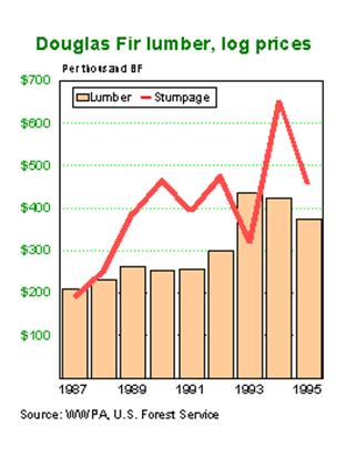 После пика цен на лесопродукты в 1993 году, они начали снижаться. К 1994 году цены на бревна скакнули до 652 долларов, после чего в 1995 году бревна продавались за 453 доллара за тысячу древесных футов. В итоге можно сказать, что цены на бревна выросли с 1987 по 1995 годы на 263 доллара за древесный фут, т.е. по логарифмической шкале — более чем вдвое. Для сравнения, цена которую стали получать лесопилки за тысячу древесных футов за это же время выросла всего на 166 долларов.