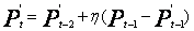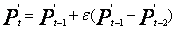 Суть концепции экстраполяционных ожиданий состоит в том, что для формирования ожиданий «ех ап1е» важно не только знание абсолютных значений экономических переменных (цен и объемов продаж) в предшествующие периоды, но и направленность их изменений. Поэтому цены для любого периода формируются как цены предшествующего периода плюс (минус) разница в ценах двух предшествующих периодов, умноженная на коэффициент ожиданий. В математической форме формирование цены для периода / может быть записано в виде: