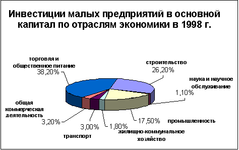 Инвестиции малых предприятий в основной капитал в 1998 г. составили 22,5 млрд. рублей, или 5,6% всех инвестиций на развитие экономики и социальной сферы России. По сравнению с 1997 г. в сопоставимых ценах они уменьшились на 3,5%. В 1998г. произошли изменения в отраслевой структуре инвестиций