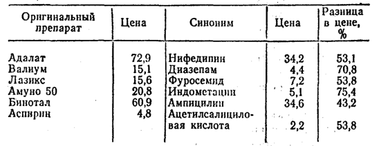 Таблица 2. Стоимость оригинальных и химически тождественных лекарственных препаратов в 80-е годы, в марках ФРГ
