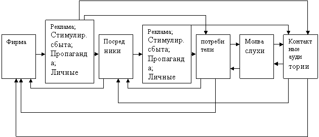 Сама она поддерживает коммуникации со своими посредниками, потребителями и различными контактными аудиториями. Ее посредники поддерживают коммуникации со своими потребителями и различными контактными аудиториями. Потребители занимаются устной коммуникацией в виде молвы и слухов друг с другом и с другими контактными аудиториями. И одновременно каждая группа поддерживает коммуникационную обратную связь со всеми остальными.