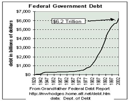 В конце апреля 2004 года внешний долг США впервые в истории страны достиг 7,015 трлн долл. Когда как 10.04.04г. его объем составлял 6,983 трлн долл. Примечательно, что в США законодательно установлен потолок этого показателя в 7,384 трлн долл. По прогнозу Минфина США, лимит будет, достигнут в период с июня по октябрь, и тогда, чтобы не допустить дефолта, администрации страны придется просить Конгресс увеличить его[10]. Кроме того, инициативы Джорджа Буша по снижению налогов привели к сокращению доходов казны. В 2003 году финансовом году дефицит достиг рекордной суммы - 734 млрд долл. Буш винит в дефиците недостаточно быстро растущую экономику, а также необходимость осуществлять многомиллиардные расходы на национальную оборону и безопасность. На рисунке 1 приведена иллюстрация с сайта Grandfather Economic Report показывающая рост государственного долга США.