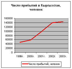 Прибывающих в Кыргызстан туристов можно разделить на туристов из стран СНГ и туристов из стран вне СНГ. Так в 2002 году Кыргызскую Республику посетило 80,5 тыс. граждан из 11 стран СНГ и 59,1 тыс. граждан из 118 стран мира. Таким образом, в 2002 году число прибытий составило 139589 человек.[25]