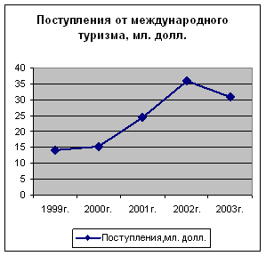 Поступления от экспорта туристических услуг также делятся на поступления из стран СНГ и из стран вне СНГ. В 2002 году поступления из стран СНГ составили 16,9 миллионов долларов США, а из стран вне СНГ – 18,8 миллионов долларов США. Динамика поступления доходов, как из стран СНГ, так и из стран вне СНГ имеет положительную тенденцию.[26]