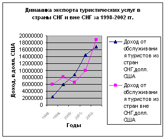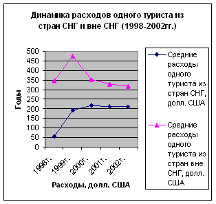 Таким образом, средние расходы одного туриста из стран СНГ за период с 1998 года по 2002 год возросли более чем в 3,5 раза, с 57,1 до 210,05 доллара США.