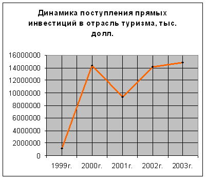 Динамика поступления прямых иностранных инвестиций в сферу туризма Кыргызстана представлена в таблице 2.24. На основе данной таблицы построена наглядная диаграмма (Диаграмма 2.26). На диаграмме наблюдается тенденция увеличения поступления прямых иностранных инвестиций в сферу туризма Кыргызстана, несмотря на спад в 2001 году.