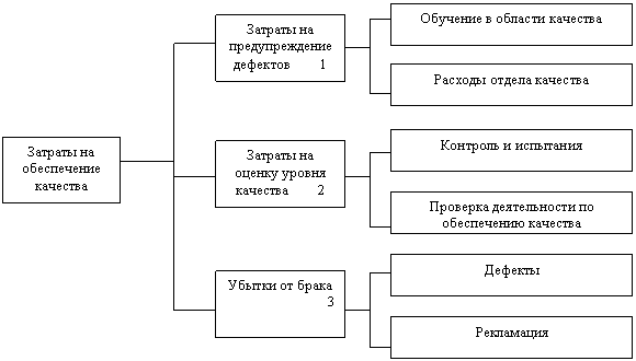 Примером, подтверждающим сказанное, является ранее упомянутая классификация А. Фейгенбаума, представленная на схеме 1. Отсутствие принципа классификации приводит к тому, что затраты, необходимые для обеспечения качества (обозначены цифрами 1, 2) приравниваются к убыткам (обозначены цифрой 3). При таком подходе невозможно оценить экономическую эффективность затрат, которая определяется сравнением затрат и потерь. Ведь увеличение затрат на обеспечение качества должно приводить к сокращению абсолютных и удельных потерь от рекламаций и ликвидации отклонений и несоответствий, выявленных в процессе изготовления продукции.