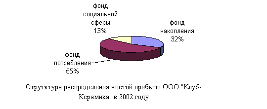 Наибольший удельный вес в структуре распределения чистой прибыли предприятия приходится на фонд потребления – 48% в 2001 году, 55% в 2002 году. Рост удельного веса данного показателя в сумме чистой прибыли свидетельствует о целенаправленной политике торгового предприятия по материальному стимулированию работников.