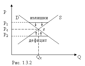 Если на рынке избыток предложения (при цене Р1), то в результате конкуренции продавцов происходит понижение цены до Рe и избыток исчезает.