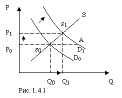 Дефицит (e0 А) продукта Q при цене Р0 повысит цену до Р1. В результате установится новое равновесие в точке e1.