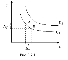 Предельной нормой замещеия (MRS) называется количество блага у, которое должно быть сокращено в обмен на увеличение блага х на единицу с тем, чтобы полезность набора осталась прежней: