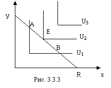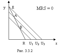 Равновесие потребителя имеет место на одной из осей в вершине угла, образуемого бюджетной линией (в точке Е). Другими словами – потребитель воздерживается от покупки блага х и все ресурсы направляет на покупку блага у.