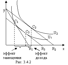 Проведем R3 параллельно R2 так, чтобы R3 касалось U1. Точка C3 разделит эффект замещения и эффект дохода.