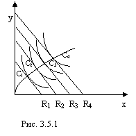 R1 – бюджетная линия, С1 – равновесие потребителя. Если снижается Рх, то R1 движется против часовой стрелки к R2; С2 – точка нового потребительского равновесия.
