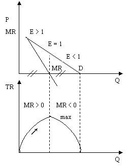 Когда спрос эластичен, значение MR положительны и общий доход растет. Когда спрос неэластичен, MR < 0 и ТR падает. Наконец, когда спрос единичной эластичности, MR = 0, а ТR – максимальный. Монополист, очевидно, ограничит объем выпуска эластичной частью кривой спроса.