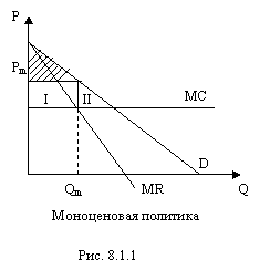 На рис. 8.1.1 видно, что прибыль монополиста равна площади прямоугольника I; заштрихованный треугольник – это потребительский излишек; площадь треугольника II – это безвозвратные потери общества из-за монопольной цены.