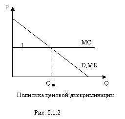 Переход к политике ценовой дискриминации (рис.8.1.2) означает, что MR=P, а график MR сливается с графиком спроса. Весь потребительский излишек переходит к продавцу, увеличивая его прибыль (площадь треугольника I на рис. 8.1.2). Исчезают и безвозвратные общественные потери за счет расширения рынка сбыта (Q`m > Qm).