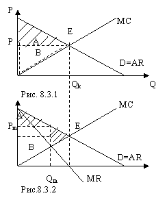 На конкурентном рынке Р = МС (рис. 8.3.1). Заштрихованный треугольник А – излишек потребителя. Треугольник В – выигрыш продавца.