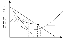 При совершенной конкуренции Р = МС; такая цена (P2 ) оптимальна с точки зрения общества, т.к. обеспечивает наиболее эффективное распределение ресурсов. Если государство установит эту цену на продукт монополиста, то фирма будет нести убытки. Регулирующие агенства могут разрешить фирме справедливую прибыль, установив цену P1 на уровне средних издержек. Хотя такая цена ведет к сокращению Q по сравнению с оптимальным случаем (Q1 < Q2), потребители получают все же больше в сравнении со случаем нерегулируемо естественной монополии (Q1 > Qm ).