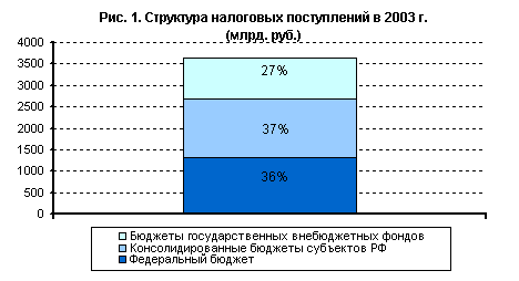15 января 2004 г. МНС сообщило о предварительных итогах по сбору налогов в бюджетную систему РФ. Во все уровни бюджетов, включая бюджеты государственных внебюджетных фондов, было собрано 3636 млрд. руб. В федеральный бюджет, за исключением ЕСН, зачисляемого в федеральный бюджет, поступило 1311,7 млрд. руб., а в консолидированные бюджеты субъектов РФ – 1359,6 млрд. руб. В бюджеты государственных внебюджетных фондов было аккумулировано 964,7 млрд. руб., в том числе ЕСН, зачисляемый в федеральный бюджет. Структура налоговых поступлений в бюджетную систему представлена на рис. 1.