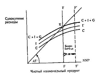 Графическое изображение равновесия высокой занятости. Чтобы применить этот плодотворный подход, мы можем использовать наши кривые расходов «потребление+инвестиции+правительство» и посмотреть, где окажется точка пересечения кривой С+I+G с вспомогательной линией, проведенной под углом 45°, характеризующей равновесие дохода. Обратимся за иллюстрацией к рис. 3.