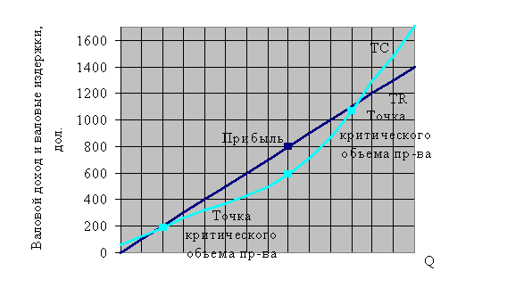 Рисунок 5 графически сравнивает валовой доход и валовые издержки. Валовой доход изображен прямой линией, потому что при чистой конкуренции каждая дополнительная единица продукции добавляет одну и ту же величину (ее цену) к валовому доходу (табл. 2). Валовые издержки возрастают с ростом производства; увеличение продукции требует большего количества ресурсов. Но степень увеличения валовых издержек меняется в зависимости от эффективности фирмы. В частности, данные об издержках отражают действие закона убывающей отдачи, согласно которому с течением времени темп роста валовых издержек становится все меньше и меньше, так как фирма использует свои постоянные ресурсы более эффективно. Потом, через некоторое время, валовые издержки начинают увеличиваться все более возрастающим темпом вследствие неэффективности, которая сопровождает чрезмерное использование оборудования фирмы. Сравнивая валовые издержки с валовым доходом на рисунке5, мы замечаем, что точка критического объема производства расположена в районе производства 2 единиц продукции. Другая такая же точка находится там, где валовые издержки сравнялись с валовым доходом, как показано на рисунке 5. Любое производство за пределами этих точек повлечет за собой убытки. Любое производство в пределах этих точек критического объема производства принесет экономическую прибыль. Максимальная прибыль достигается там, где разница по вертикали между графиками валового дохода и валовых издержек является наибольшей. Для наших конкретных данных — это 8 единиц выпуска, при соответствующей максимальной прибыли 210 дол.