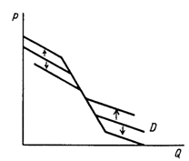 Q^D = a - bP, если P’’ >= P >= P’, a - bP + c(P’’ - P), если P’ > P