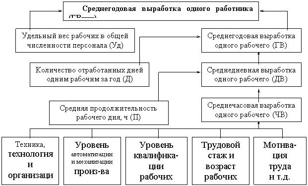 Между наиболее обобщающим показателем – годовой выработкой одного работающего и таким частным показателем, как часовая выработка одного рабочего, лежит область воздействия ряда факторов, которые характеризуют экстенсивность труда. К ним относятся: количество отработанных дней в году, средняя продолжительность рабочего дня, структура производственного персонала.