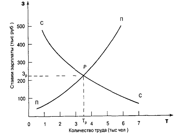 Закономерность взаимодействия спроса и предложения применительно к товару «рабочая сила» проявляется следующим образом: в точке пересечения кривых спроса (С) и предложения (П) определяется равновесная ставка заработной платы (Р) и равновесный уровень занятости данного вида труда (рис. 3). Это означает, что при ставке заработной платы 3 и при численности нанятых работников Т предложение равно спросу (число работников, которые согласны работать на предложенных условиях оплаты труда).