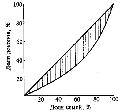Теоретическая возможность абсолютно равного распределения дохода представлена биссектрисой, которая указывает на то, что любой данный процент семей получает соответствующий процент