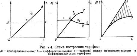 Смысл дифференциальной системы построения тарифов заключается в том, что она представляет пассажиру, едущему на большое расстояние, скидку. Значение этой скидки (разница между пропорциональным и дифференциальным тарифами) графически показано заштрихованным пространством, заключенным между прямой 0В и кривой ОГ (рис. 7.4, б).