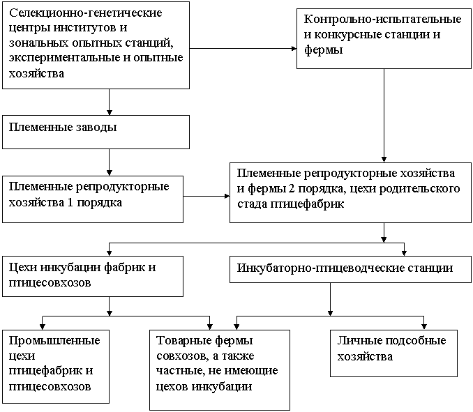 Внутриотраслевая специализация привела к организации широкой сети специализированных племенных, товарных хозяйств, инкубаторно-птицеводческих станций, частных и совхозных птицеводческих ферм, которые тесно связаны между собой (схема 1.)