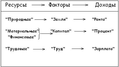 Каждый фактор производства способен принести своему владельцу доход: «капитал» приносит «процент», «труд» -- «зарплату», а «земля» — «ренту»: