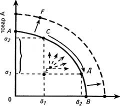 Если мы возьмем точку, находящуюся внутри области производственных возможностей (например, точку Е), то она также характеризует определенное количественное соотношение товаров А и В. Но поскольку точка Е не достигает кривой производственных возможностей, то она, согласно условиям нашего графика, есть результат неполного, неэффективного использования имеющихся производственных ресурсов. Выбор данной точки означал бы ориентацию на заведомо неэффективное производство, на неполное использование имеющихся ресурсов. Поэтому ориентация на такую точку может быть только вынужденной, в силу каких-либо экономических или внеэкономических обстоятельств (падение спроса, высокие налоги, переход к производству новой продукции и т. д.).