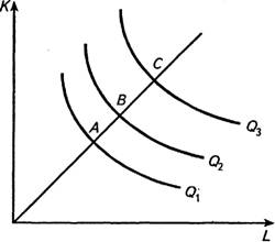 Если фирма расширяет производство и выпускает продукцию последовательно в точках А, В и С, то изокванта передвигается от меньшего выпуска к большему, а линия, выходящая из начала координат, отражает путь развития фирмы. Он может быть и не столь прямолинейным, как это показано на рис. 1.4.