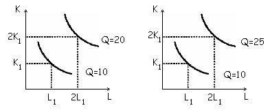 Если две фирмы расходуют факторы производства в сочетаниях (L1,K1) и (L2,K2), то объединение фирм и, следовательно, затрачиваемых ресурсов, целесообразно только в том случае, если после объединения выпуск превосходит, или, в крайнем случае, равен суммарному выпуску двух ранее самостоятельных фирм.