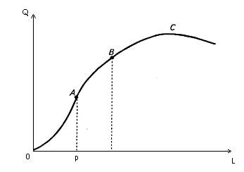 Допустим, затраты капитала постоянны. Фирма постепенно вовлекает в процесс производства первого, второго и т.д. работников. Тогда выпуск продукции для типичной фирмы графически (наглядно) представлен на рис. 1.6. кривой общего продукта. При использовании в процессе производства затрат труда от нуля до величины 0Р затраты растут медленнее объема выпуска. В точке А выпуск равен АР, а затраты труда ОР. Когда используется труд, скажем, трех или пяти работников, то производственные мощности фирмы полностью не используются.