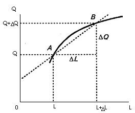 Предельный продукт труда измеряется отношением прироста выпуска к вызвавшему его приросту затрат труда Q/L. Названные приросты графически показаны на фрагменте рис. 1.7. При увеличении затрат труда от L доL + L , т.е. на L, выпуск увеличивается на Q.