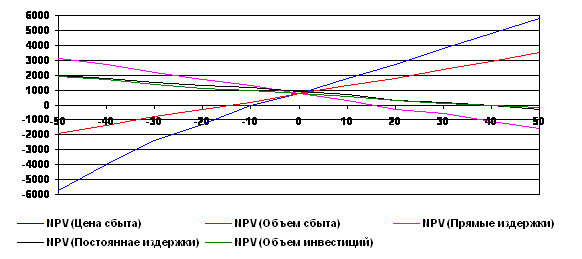 В результате проведенного анализа рассчитываются графики NPV (чистого приведенного дохода) от перечисленных параметров и определяются их критические значения (стр.38).