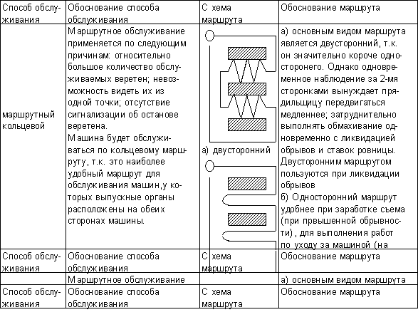 Обычно прядильщица применяет маршрутный кольцевой способ обслуживания, при котором за один обход обслуживаемого участка выполняет все необходимые работы. Важной целью планирования является максимально возможное сокращение длительности обхода, т.к. от этого зависит длительность перерывов из-за совпадения. Сокращению длительности обхода способствует правильно выбранный маршрут и быстрое и точное выполнение рабочих приемов. Схему маршрута и его обоснование приведены в таблице 1.7.