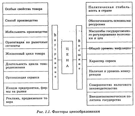 Являясь количественной категорией, цена формируется под воздействием двух групп факторов - внутренних и внешних (рис. 1.1). Внутренние факторы, т. е. факторы микроэкономического уровня зависят от деятельности самого предприятия, фирмы. Товар, характеризующийся особыми свойствами, уникальными достоинствами и способами его обработки непременно будет иметь более .высокую цену, отражающую его качество, технический уровень. Способ производства определяет серийность выпуска продукции. Как правило, продукция мелкосерийного и индивидуального производства имеет более высокую себестоимость и соответственно цену. Товары же массового производства отличаются низкими издержками и на них устанавливаются относительно низкие цены. При частых и интенсивных технологических изменениях товар будет иметь более высокую цену.