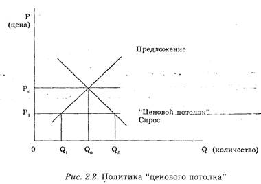 Они формируют так называемый рынок продавца, диктующего свои условия покупателям, ведут к образованию дефицита продукции на рынке (Q2 > Q1). Размер потребления на таком рынке оказывается ниже того уровня, который был бы в условиях равновесия (Q1 < Q0). В таких условиях государство часто вынуждено поддерживать производства, выпускающие продукцию по низким ценам путем выделения различных дотаций, субсидий, что в конечном счете ведет к усилению разбалансированности экономики, появлению новых проблем. Практика использования политики "ценового потолка" в экономике республики кроме указанных последствий порождала и такие явления, как очереди, черный рынок, коррупция на государственных предприятиях.