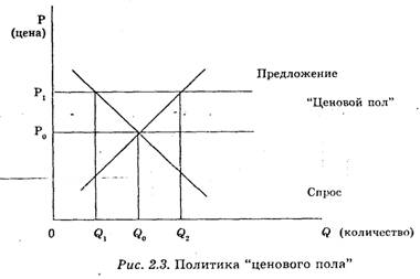 которые государство вынуждено скупать и каким-то образом затем ими распоряжаться (образовывать запасы, реализовывать на внешнем рынке и т. п.). Уровень потребления в условиях проведения политики "ценового пола" тоже оказывается ниже, чем в условиях равновесного рынка (Q1 < Q2).