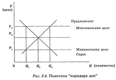 Политика "коридора цен" заключается в том, что устанавливаются два предела цен: верхний и нижний. Цены, таким образом, одновременно ограничены максимальным и минимальным