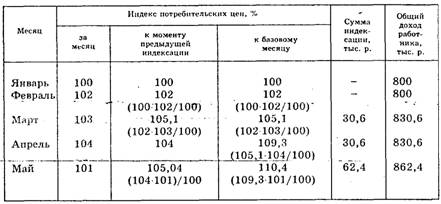 Пример. Определить по месяцам выплаты, частично возмещающие работнику потери, вызванные ростом потребительских цен и общий, его доход. Оклад работника бюджетной организации в январе месяце составил 800 тыс. р. Минимальная заработная плата - 200 тыс. р. Изменение потребительских цен по месяцам и расчет дополнительных выплат работнику за период в связи с инфляцией отражены в приведенной ниже таблице.